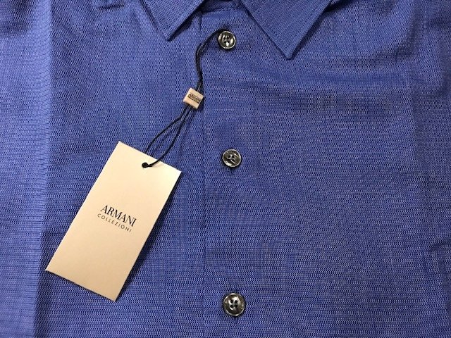 marka: Armani Collezioniopis: koszulakolor: indygorozmiar: Lwymiary: szerokość 56 cm, długość 78,5 cm, rękaw od ramienia 66 cm, od pachy 51 cmskład: 100% bawełnacena: 900,00 - 50% = 450,00