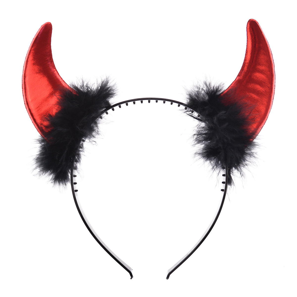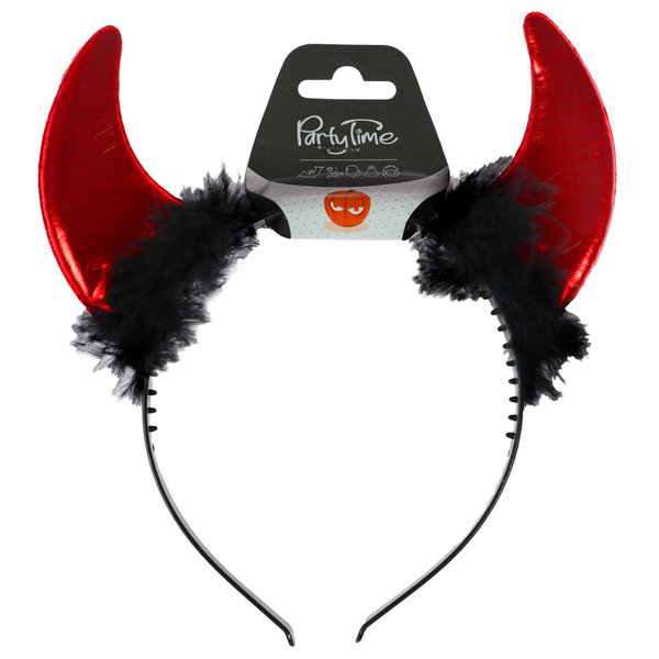 Czerwone, błyszczące rogi wykonane z materiału o metalicznym połysku osadzone na opasce. W miejscu łączenia rogu z opaską zostało dodane ozdobne wykończenie z czarnych delikatnych piórek. Element kostiumu na halloween, bal karnawałowy bądź samodzielny gadżet. Rozmiar opaski to 21 cm.