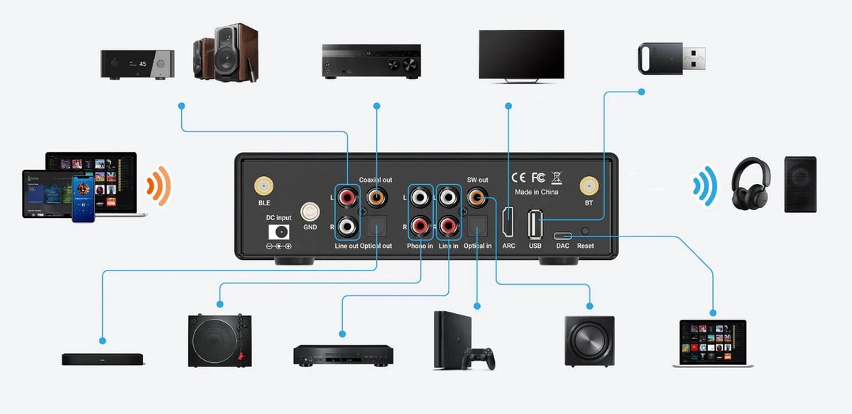 BP50 posiada różne interfejsy z funkcjami nadajnika i odbiornika Bluetooth.5 wejść i 4 wyjścia: wejście HDMI ARC, wejście phono, wejście RCA, wejście optyczne, wejście USB, wyjście subwoofera, wyjście DAC typu C, wyjście optyczne, wyjście koncentryczne.