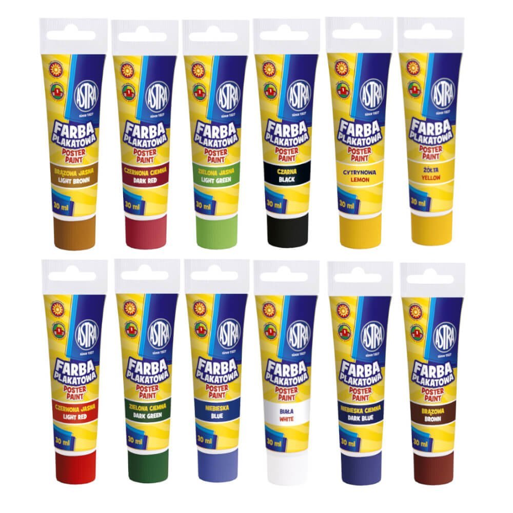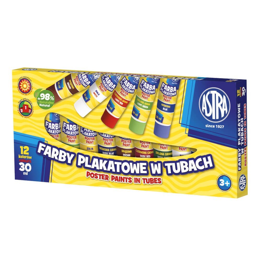 Farby plakatowe Astra 12 kolorów - tuba 30 mlBardzo wydajne, kryjące farby wodorozcieńczalne, czyste i intensywne barwy do malowania na papierze, kartonie, drewnie, nieglazurowanej ceramice, ...