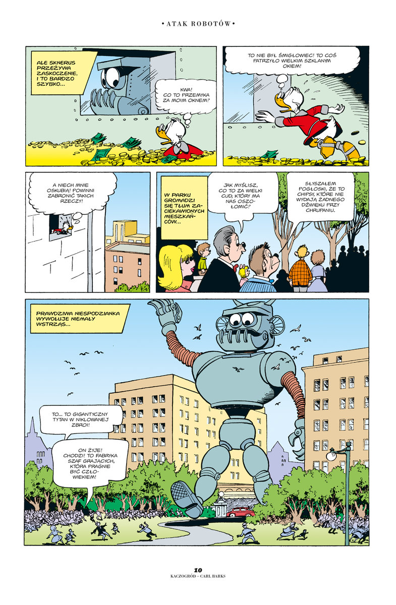 Niniejszy album zawiera komiksy Carla Barksa z lat 1964–1966. Czytelnik znajdzie tu między innymi siedem długich opowieści liczących dwadzieścia lub więcej stron. Tytułowy „Atak robotów” to rozgrywająca się w Kaczogrodzie historia, w której spokojne życie mieszkańców po raz kolejny przerywają Bracia Be. W rodzinnym mieście Donalda toczy się także akcja komiksu „Upiór w katedrze”. Tutaj Barks miał okazję popisać się umiejętnością rysowania elementów gotyckiej architektury. W pozostałych dłuższych opowieściach Sknerus, a także Donald i siostrzeńcy odbywają podróże, czy to bliższe – jak w „Bagnach Zapomnienia”, czy też bardzo egzotyczne, jak w „McKwaczu z Arabii” bądź „Kaczorach na safari”. Dwie z owych wypraw mają bezpośredni związek z przeszłością Sknerusa jako poszukiwacza złota i nic dziwnego, że z tych opowieści obficie czerpali późniejsi kronikarze życia najbogatszego kaczora świata – Don Rosa i Kari Korhonen. Komiks „Nad rzeką Jukon” to debiut Śliskiego Kręta, lichwiarza i antagonisty Sknerusa. W „Pociągu z miasta duchów” pojawia się z kolei inny jego przeciwnik – Twardogłowy McSkunks. Obie te postaci powróciły później kilka razy w słynnym dziele Rosy „Życie i czasy Sknerusa McKwacza”.
