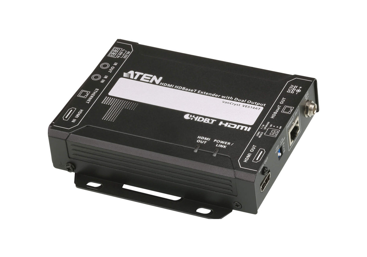 Nadajnik HDMI VE814AT z obsługą ATB HDBaseT z pojedynczym kablem Cat 5e / 6 / 6a lub kablem ATEN 2L-2910 Cat 6 może przesyłać sygnały HDMI w odległości do 100 metrów. Ze względu na podwójne wyjście synchroniczne przedłużacz VE814AT może przesyłać sygnał wideo do dwóch zdalnie umieszczonych wyświetlaczy i jednego zlokalizowanego lokalnie. Będąc kompatybilnym z HDCP 2.2, ma maksymalną prędkość przesyłania danych (10,2 Gb / s), obsługuje funkcje HDMI, w tym 3D, Deep Color, a także przesyła obrazy do rozdzielczości 4K do 100 metrów.