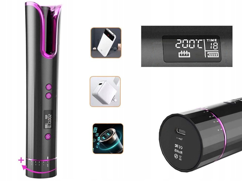 Urządzenie posiada wyświetlacz LCD na którym możemy sprawdzić: poziom naładowania baterii, kierunek robienia loków, temperaturę i czas pracy. Wybór temperatury posiada 6 ustawień ciepła (150 ℃ 170 ℃ 190 ℃ 200 ℃) można również wybrać temperaturę w skali fahrenheita. Możliwy jest również wybór kierunku w jakim loki mają być zakręcone (lewy lub prawy).