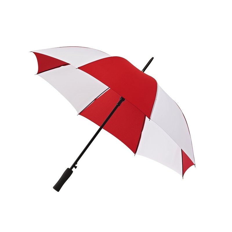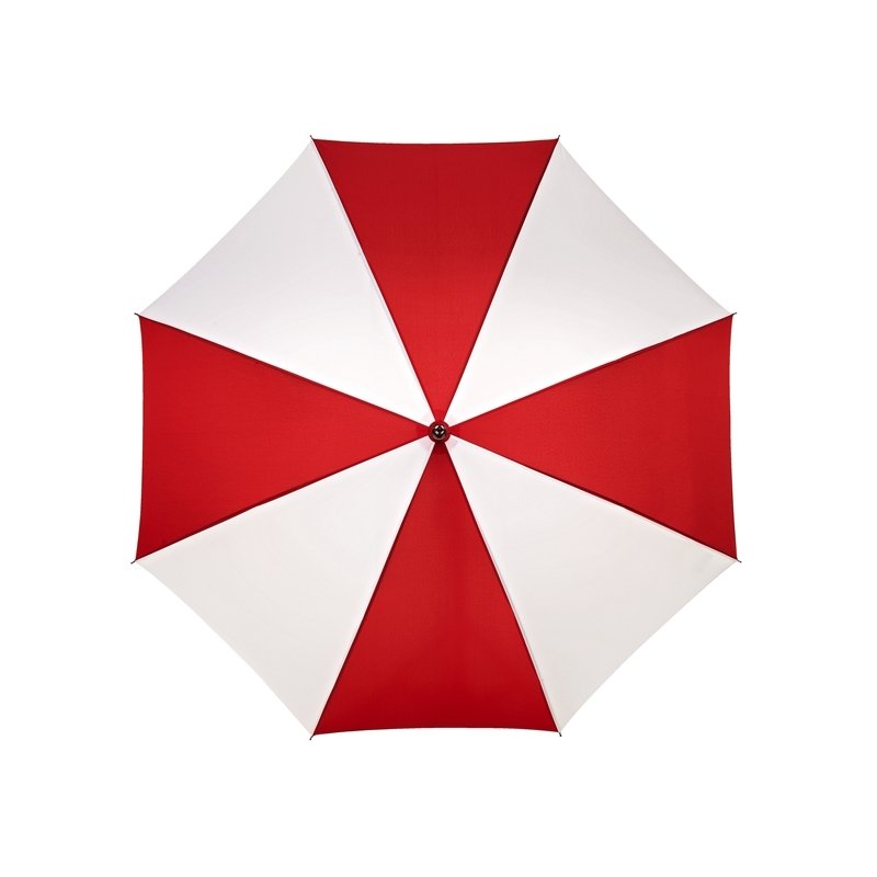 Automatyczna parasolka w kolorze biało-czerwonym. Rączka parasolki z przyjemnego tworzywa, wyprofilowana została do wygodnego trzymania. Czasza wykonana z poliestru chroniącego przed deszczem, stelaż metalowy dobrze chroni przed wiatrem.