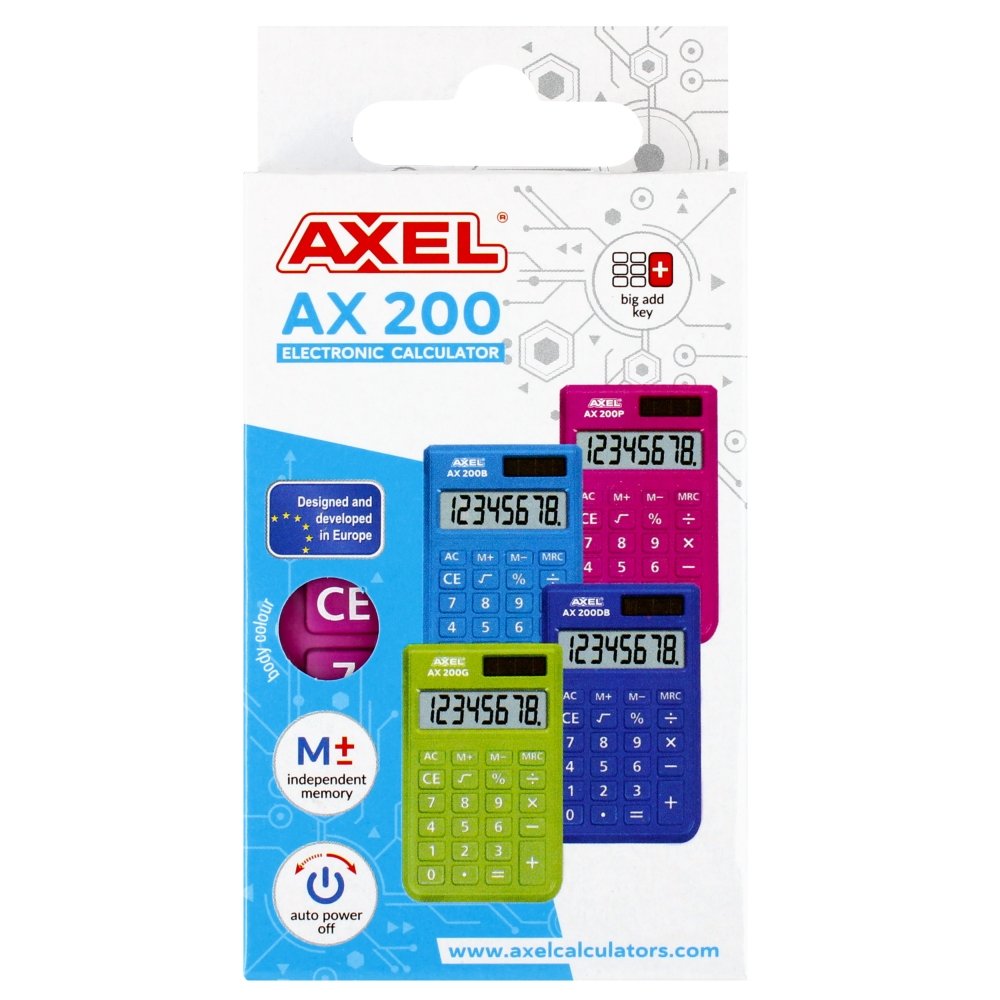 Axel, Kalkulator AX-200 różowyZalety produktu: Funkcjonalny kalkulator do użytku biurowego, szkolnego i domowego. Solidna konstrukcja i mocne materiały gwarantują dużą żywotność kalkulatorów. ...