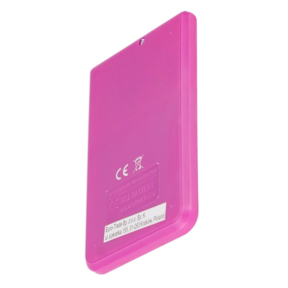 Zalety produktu: Funkcjonalny kalkulator do użytku biurowego, szkolnego i domowego. Solidna konstrukcja i mocne materiały gwarantują dużą żywotność kalkulatorów. Kalkulator posiada niezależną pamięć, funkcję automatycznego wyłącznika, wyświetlacz aż do 8 cyfr. Kalkulator w różowym kolorze. Posiada gumowe przyciski. Wymiary/waga/baterie: wymiary produktu sze. x wys. x gł. cm : 6x10x1, wymiary opakowania szer. x wys. x gł. cm : 6x12x1, waga produktu bez opakowania kg : 0,03 kg, waga produktu w opakowaniu kg : 0,04 kg, nie wymaga zasilania bateriami. Produkt pakowany w kartonik.