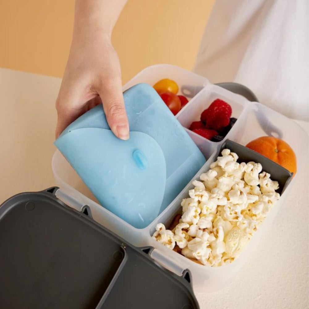 Silikonowa, zwijana i łatwa w czyszczeniu kieszeń na kanapki, którą można używać samodzielnie lub umieścić w lunchboxie marki B.Box. To akcesorium uniezależnia rodziny od jednorazowych opakowań oraz folii czy papieru śniadaniowego. Prostokątna saszetka jest idealna na kanapkę lub inną, małą przekąskę. Silikon jest materiałem bezpiecznym i pozbawionym BPA. Dodatkowo kieszonka daje się bezproblemowo chłodzić w lodówce oraz zamrażać. Zabrudzone etui łatwo przemyć wodą i wysuszyć.