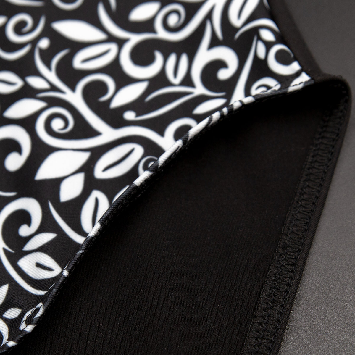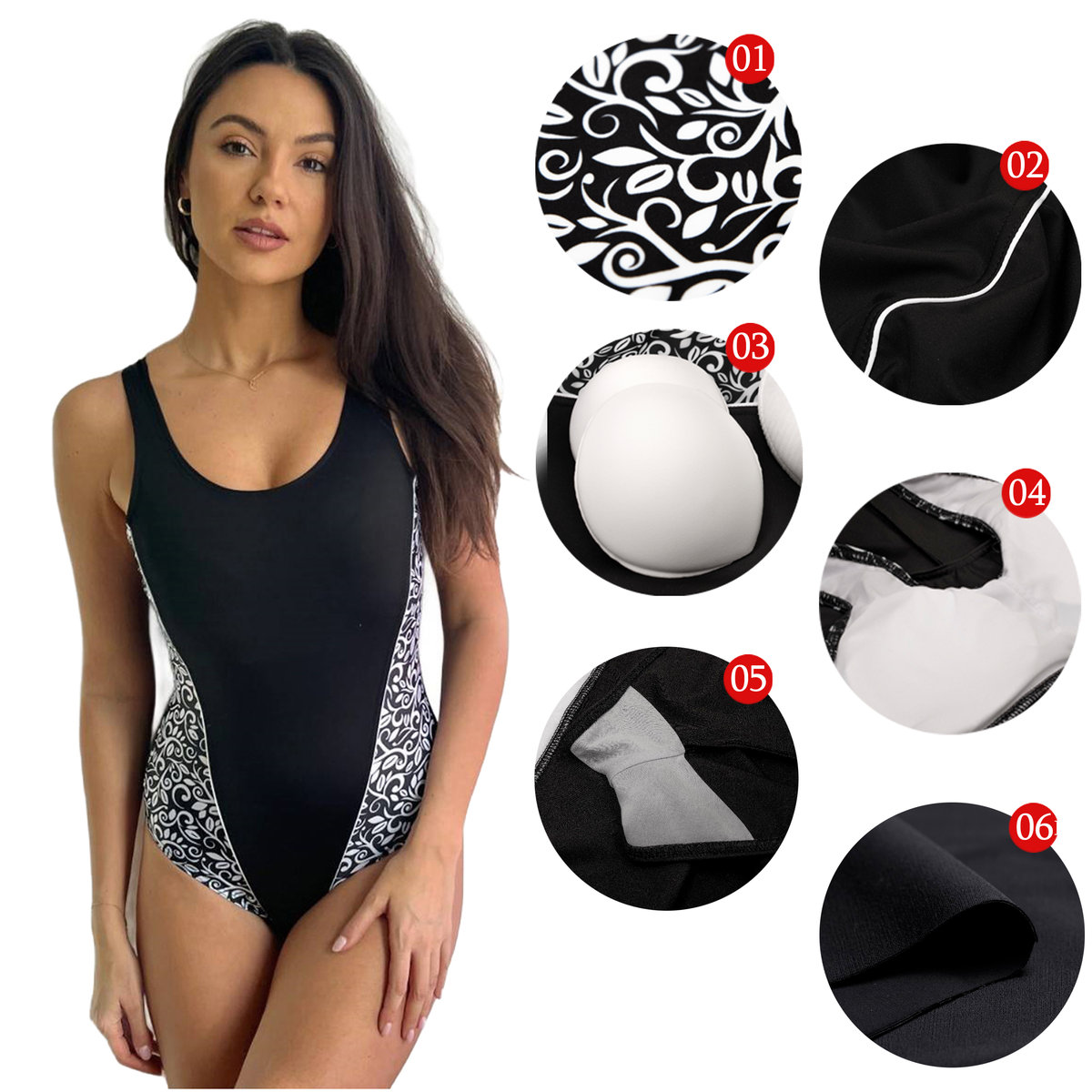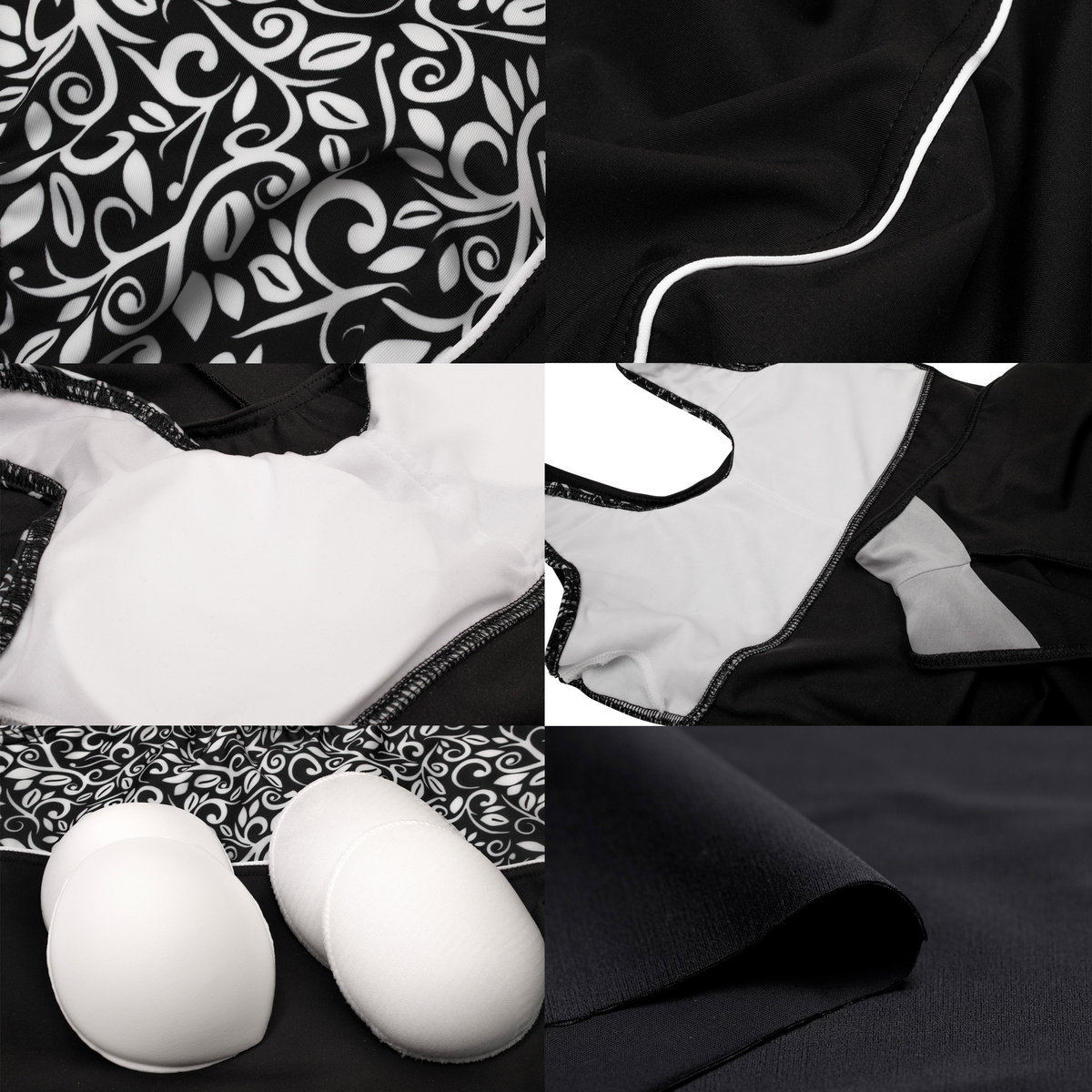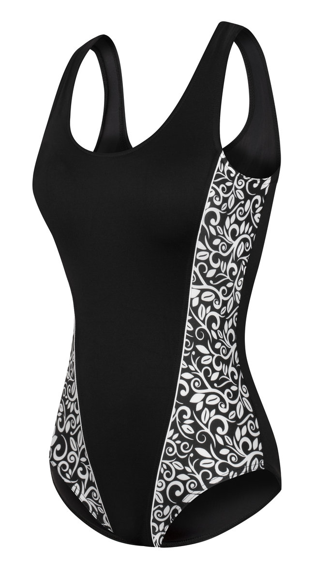 Kostium dostępny jest w uniwersalnym czarno-białym wzorze z eleganckim motywem kwiatowym. Materiał o gramaturze 190 g/m2 jest odporny na prześwitywanie, co gwarantuje poczucie bezpieczeństwa na co dzień. Dodatkowo, strój charakteryzuje się wysoką odpornością na chlor i słoną wodę, a także ochroną przed promieniowaniem UV, co czyni go idealnym wyborem na letnie dni.