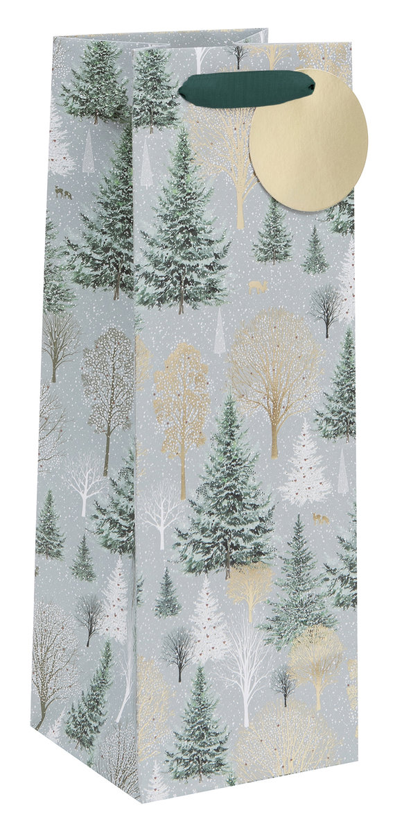 torba prezentowa świąteczna na butelkę ozdobiona grafiką przedstawiającą zimowy las uchwyty z ciemnozielonej tasiemki rozmiar: XL kolor: szary, ciemnozielony, wzór