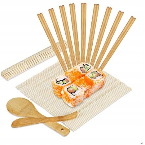 WSPANIAŁY BAMBUSOWY ZESTAW DO SUSHI 14 ELEMENTÓW ZESTAW ZAWIERA:5 PODWÓJNYCH PAŁECZEK2 MATY BAMBUSOWEBAMBUSOWY NÓŻBAMBUSOWĄ ŁYŻKĘ(w zestawie nie ma metalowego noża widocznego na zdjęciu ...