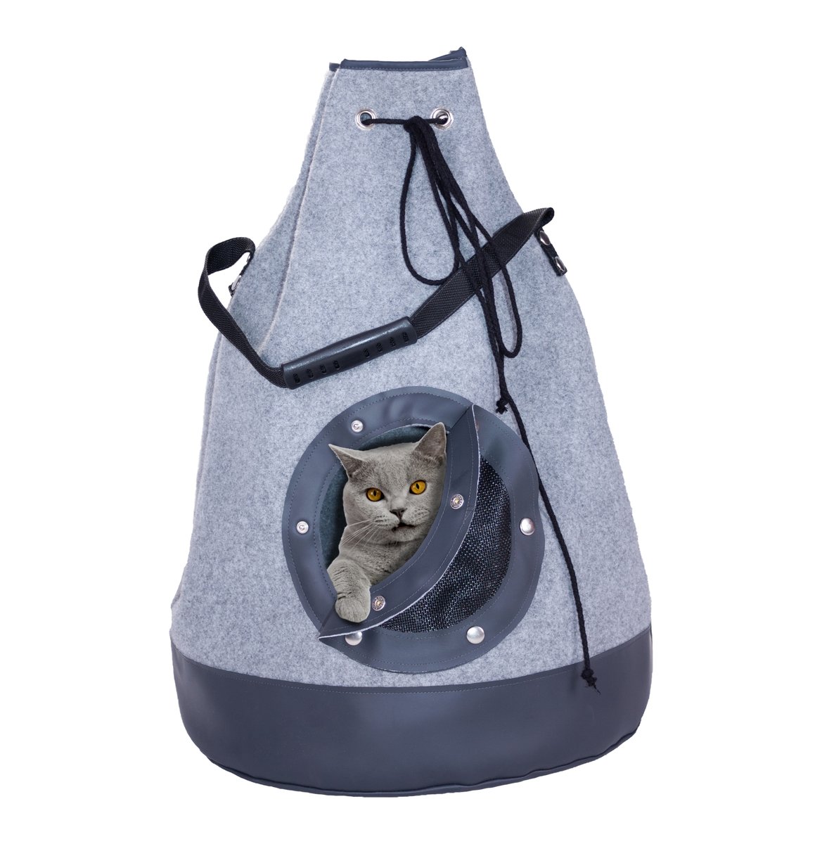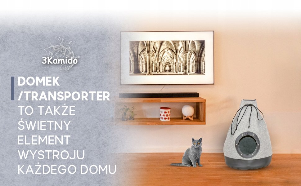Domek, legowisko dla kota z dopinaną rączką i osłoną na czas transportu, kieszenią na zabawki i smakołyki oraz nieprzemakalną matą.Wymiary: 43 x 43 x 64 cm