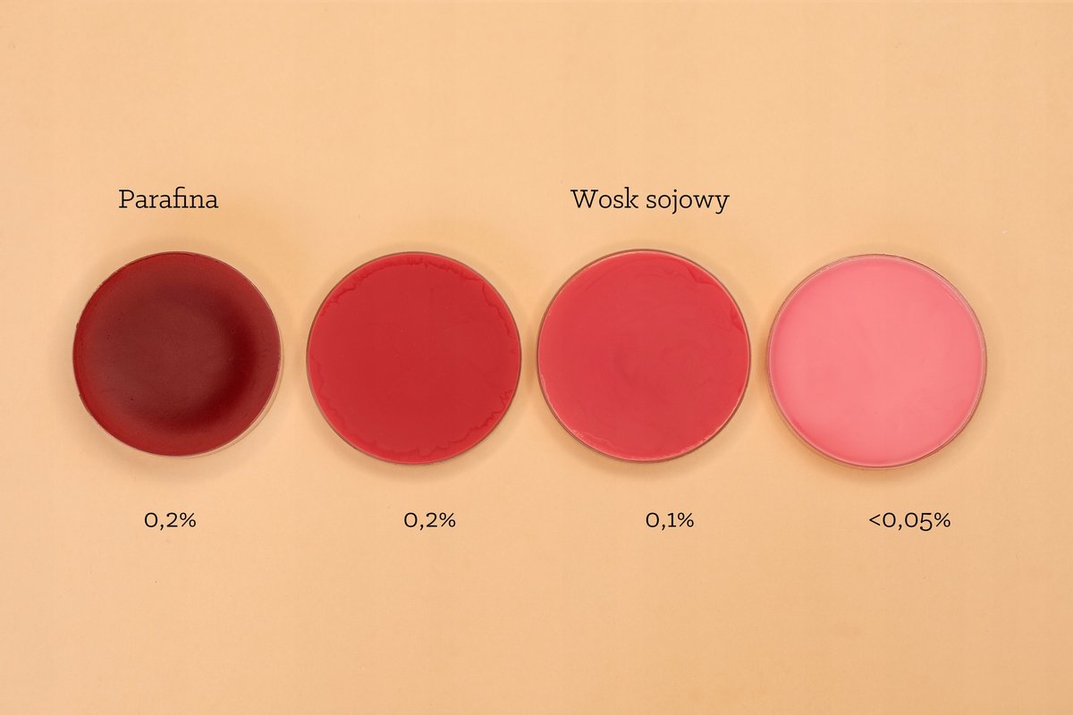Zdjęcie poglądowe przedstawia barwę świecy przy zalecanej wydajności dla PARAFINY. Na barwę świecy wpływa rodzaj barwionego surowca! Wosk sojowy inaczej oddaje kolor.