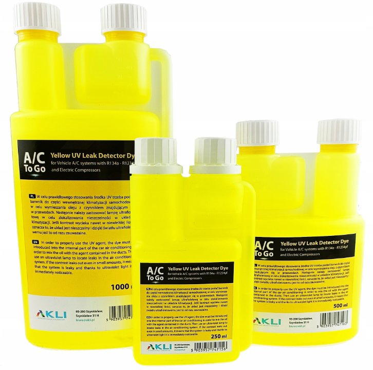 Barwnik UV do klimatyzacji samochodowej R134a o pojemności 250ml Przeznaczony do stosowania w układach klimatyzacji wykorzystujących czynniki chłodnicze: R134a R1234yf R404a R410a R407c ...