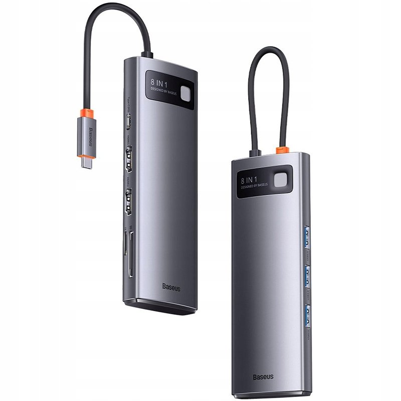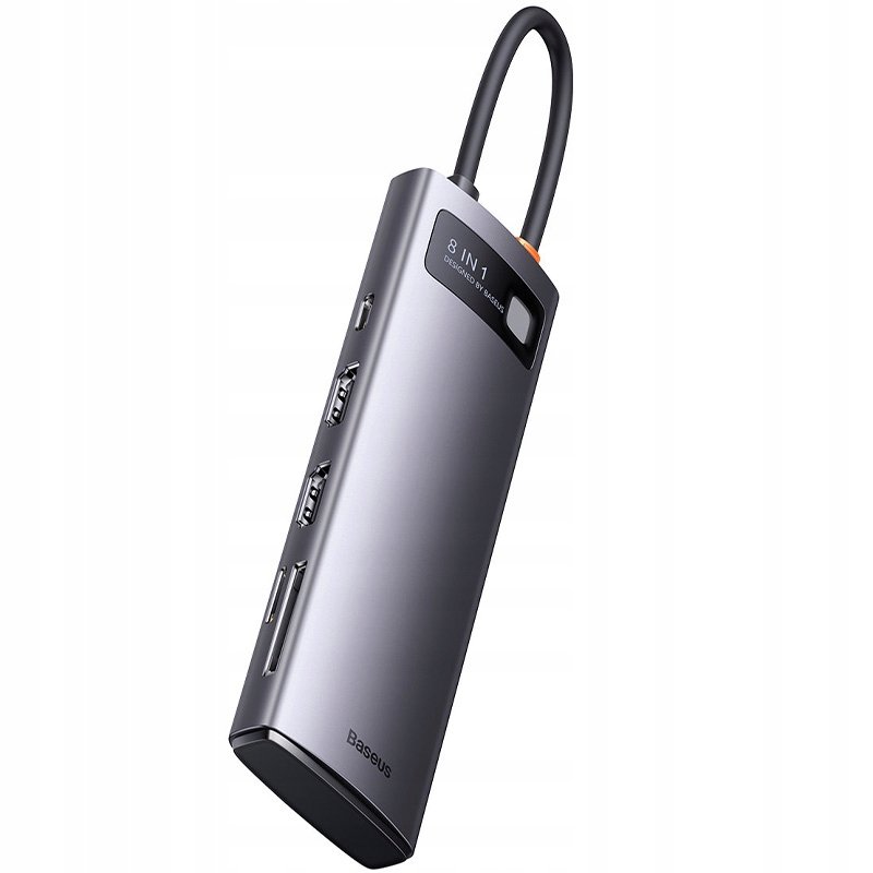 Baseus Metal Gleam 8w1 Type - C HubDla laptopów i komputerów z portem USB-CWersja kolorystyczna: Grey (szara)Porty: (1x USB-C / 2x HDMI / 3x USB 3.2 / 1x Power Delivery / 1x czytnik kart SD / 1x ...