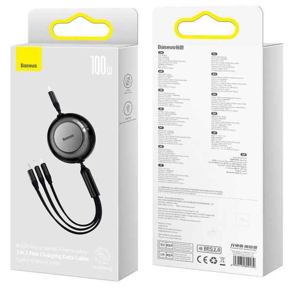 - Model: Bright Mirror 2 Series Retractable 3-in-1 Fast Charging Data Cable Type-C to M+L+C 100W 1.1m Black