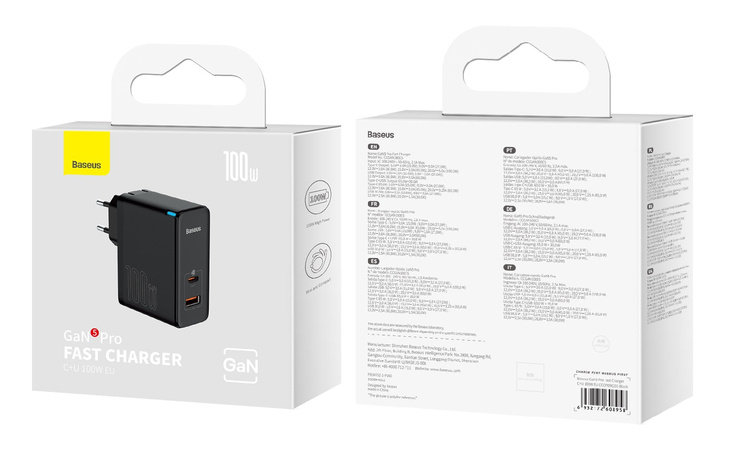 - Nazwa: Baseus GaN5 Pro Fast Charger C+U 100W EU Black (With Mini White Cable Type-C to Type-C 100W(20V/5A) 1m Black)