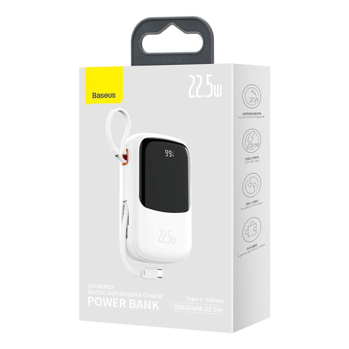 Baseus Qpow Digital Display powerbank z szybkim ładowaniem 20000mAh 22,5W QC/PD/SCP/FCP z wbudowanym kablem USB-C biały