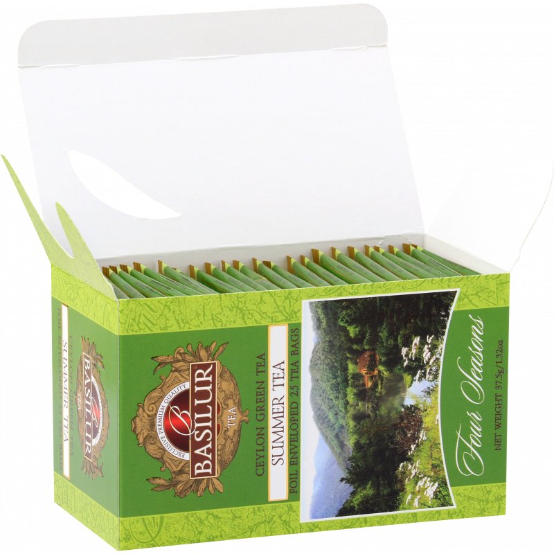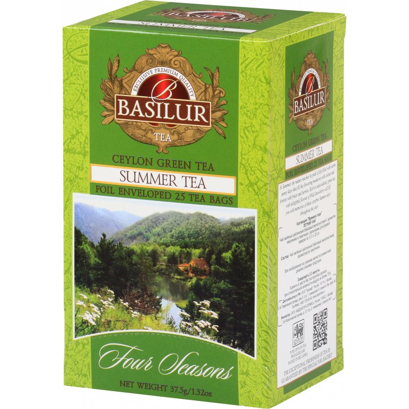 Kompozycja starannie wyselekcjonowanych liści zielonej herbaty cejlońskiej z dodatkiem naturalnego aromatu poziomkowego. Delikatny smak naparu doskonale zwieńcza owocowa nuta. Basilur Summer Tea można pić zarówno w klasycznej wersji na gorąco, jak i w formie gaszącej pragnienie, schłodzonej ice tea. Tekturowe opakowanie z pięknym motywem letniej, zielonej Sri Lanki sprawia, że jest to idealna propozycja na prezent dla miłośnika herbaty. Liczba saszetek: 25 szt. Międzynarodowe oznaczenie klasy jakości herbaty: FNGS (Fannings) - drobne, podłużne włókna i wzdłużnie łamane listki. Wymiary opakowania: 8 x 7 x 13 cm