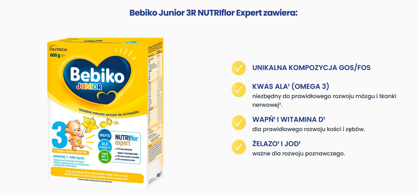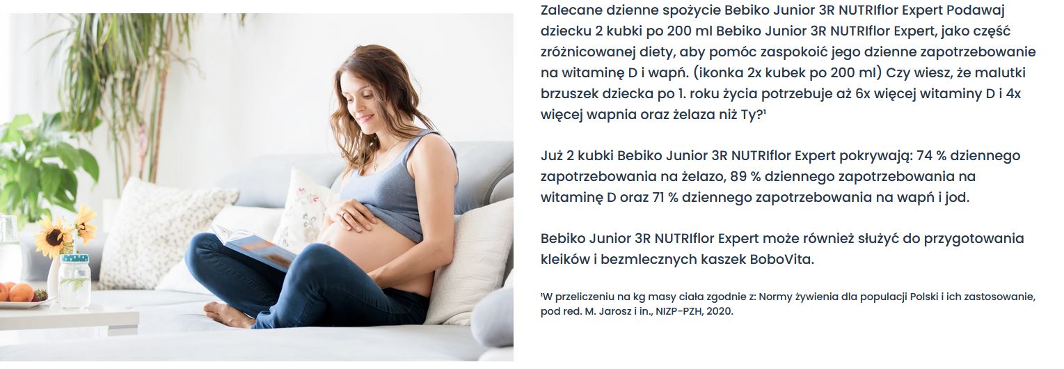 Podawaj dziecku 2 kubki po 200 ml Bebiko Junior 3R NUTRIflor Expert, jako część zróżnicowanej diety, aby pomóc zaspokoić jego dzienne zapotrzebowanie m.in. na wapń, żelazo, jod i witaminę D.