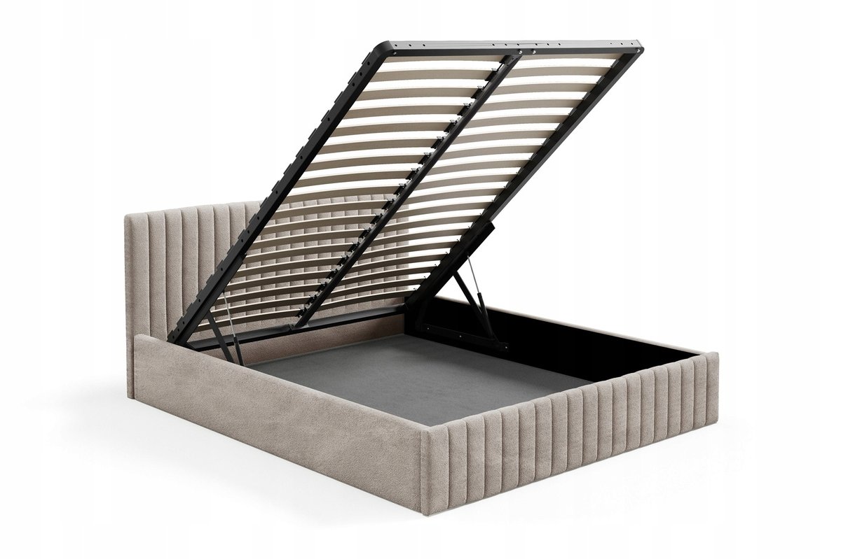 - Stelaża z podnośnikiem: Opcja podnośnika stelaża zapewnia łatwy dostęp do pojemnika na pościel. Dno pojemnika wykonane z włókniny tapicerskiej mocowanej na rzep do boków (pojemnik nie posiada maksymalnego obciążenia, tkaninę można odpiąć, aby utrzymać czystość pod łóżkiem)