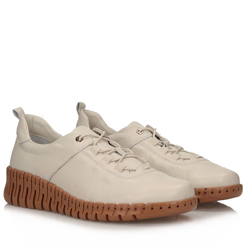 Beżowe sneakersy damskie Toscanio BK 164 to doskonały wybór dla kobiet ceniących sobie wygodę i modny wygląd. Wykonane z wysokiej jakości skóry licowej, wyróżniają się eleganckim, migdałowym noskiem