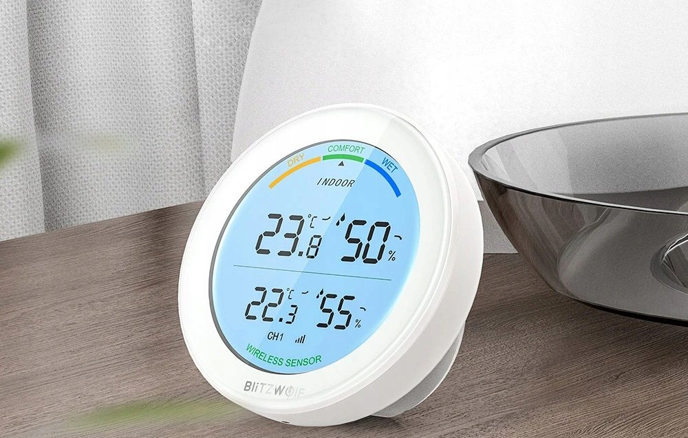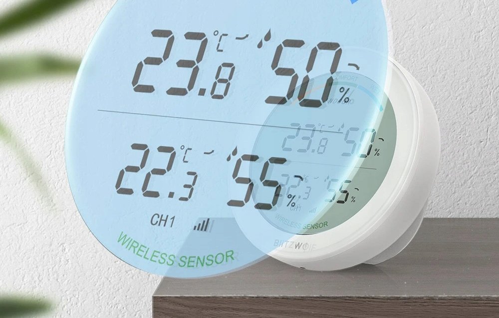 BW-WS01 pozwala monitorować wilgotność powietrza i temperaturę w kilku lokalizacjach jednocześnie. Zasięg urządzenia wynosi do 30 m na otwartej przestrzeni lub do 10 m ze ścianami.