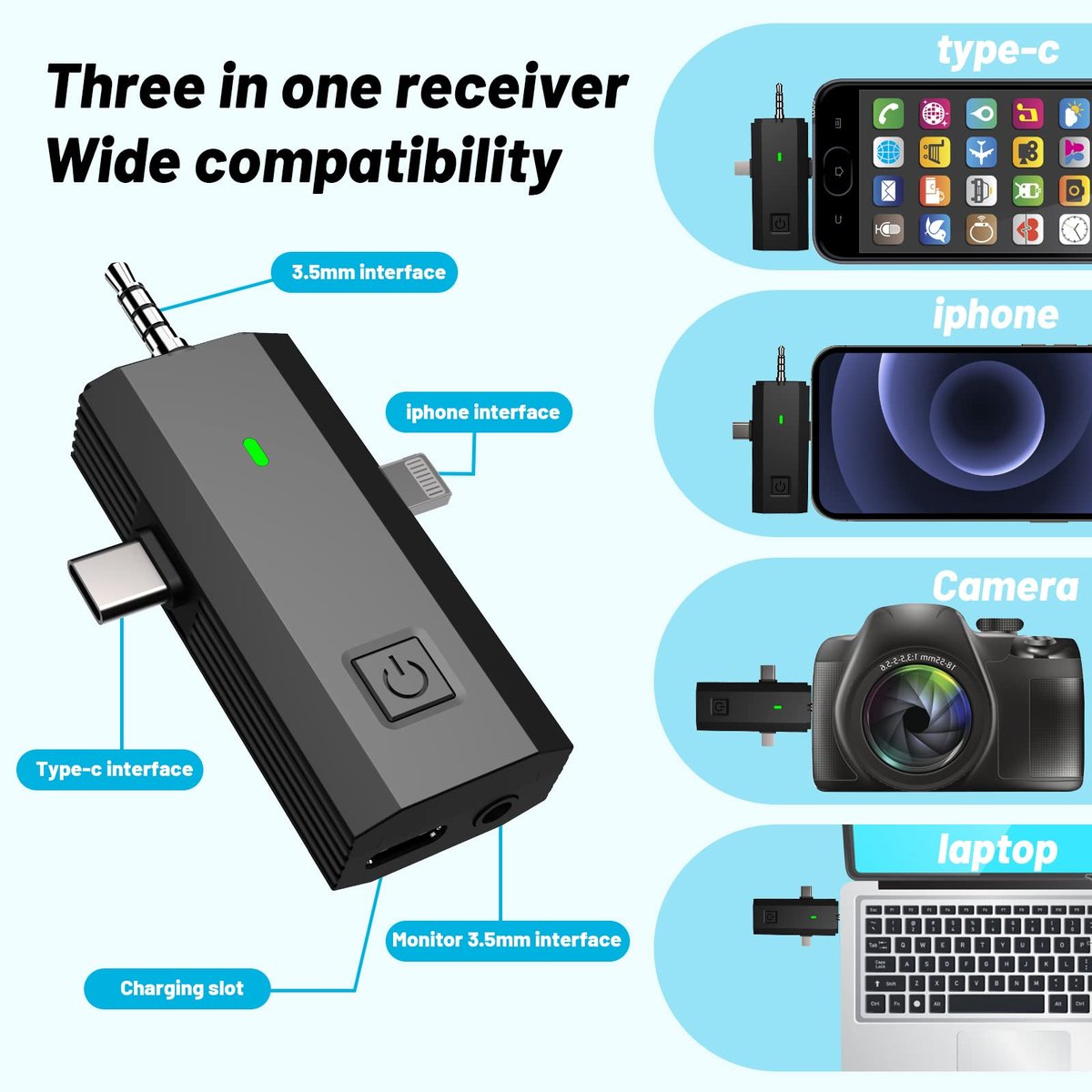 【Szeroka kompatybilność】Nasz ulepszony mini mikrofon oferuje szeroką kompatybilność. Dzięki nowemu, ulepszonemu odbiornikowi interfejsu „trzy w jednym” możesz łatwo podłączyć go do większości smartfonów z systemem Android, iPhone'ów, iPadów, aparatów fotograficznych ze złączem 3,5 mm, komputerów PC, laptopów, MacBooków i innych urządzeń.
