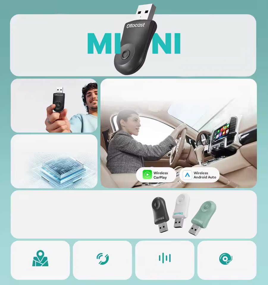 Ottocast Mini 2w1 CarPlay / Android Auto to kompaktowe i innowacyjne urządzenie, które umożliwia bezprzewodowe korzystanie z Android Auto/CarPlay w samochodzie. Dzięki łatwej instalacji i intuicyjnej obsłudze, pozwala na bezproblemowe połączenie Twojego telefonu z systemem multimedialnym pojazdu, zapewniając dostęp do map, muzyki, wiadomości i innych aplikacji bez użycia kabli. Mini Wireless Android Auto gwarantuje bezpieczne i wygodne korzystanie z funkcji telefonu podczas jazdy, poprawiając komfort i koncentrację na drodze.