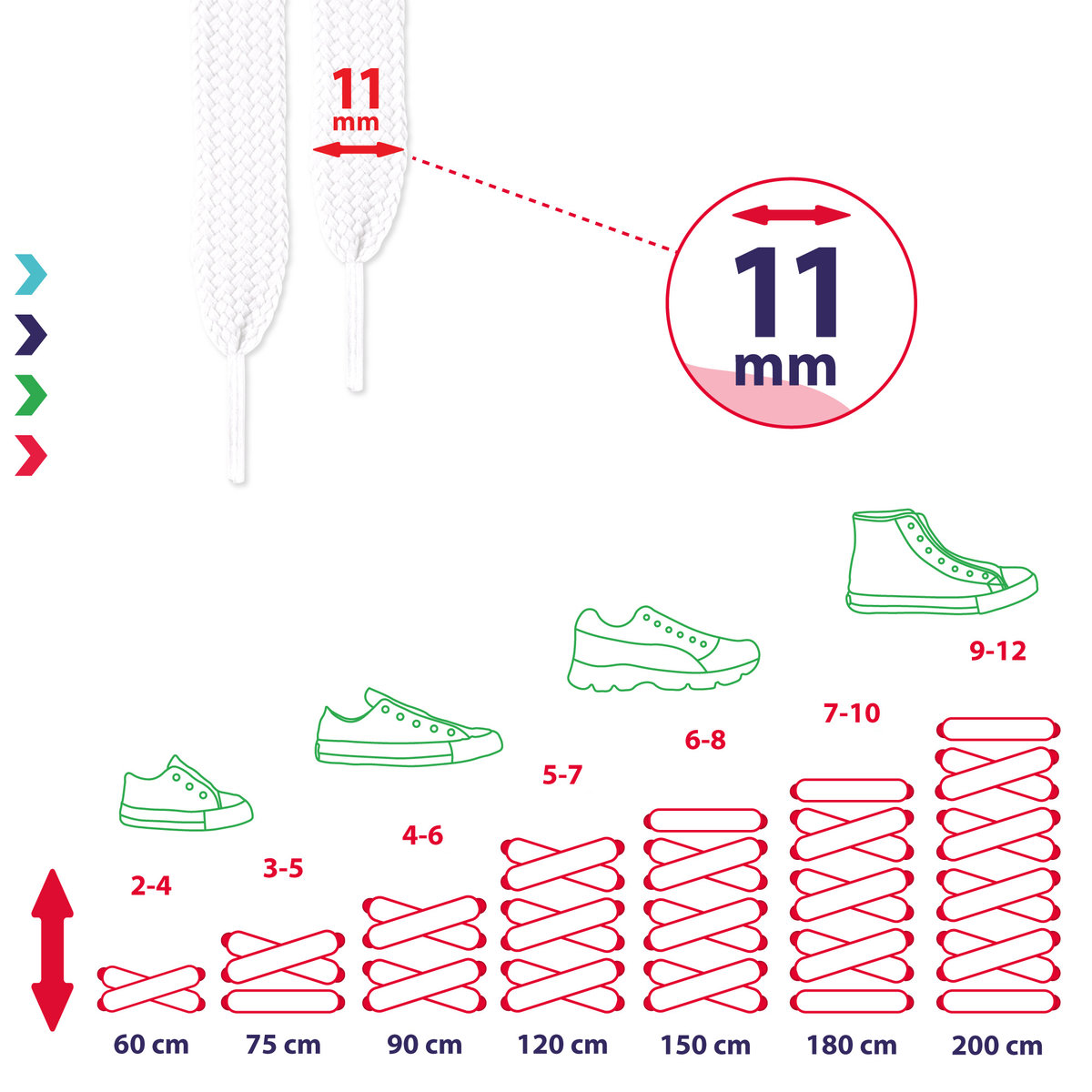Nasze sznurowadła mają 11 mm grubości. Pasują do wszystkich popularnych butów. Zmierz swoje stare sznurówki i dopasuj odpowiednią długość. Lub skorzystaj ze zdjęcia obok.
