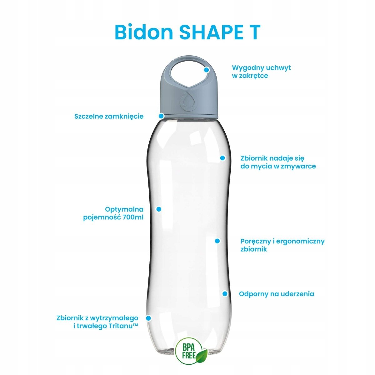 Bidon na Wodę Dafi SHAPE T 0,7l Kolor StalowyBidon SHAPE T w kolorze stalowym (poj. 700 ml) Tritanowy bidon na wodę filtrowaną, gazowaną i inne napoje. Trwały i wytrzymały bidon Dafi ...