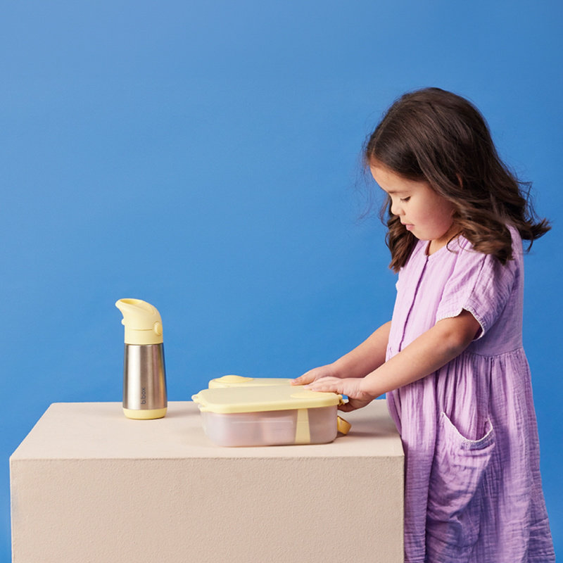 Innowacyjna termobutelka ze słomką marki b.box. Dzięki podwójnym ściankom ze stali nierdzewnej utrzymuje temperaturę do 6 godzin.