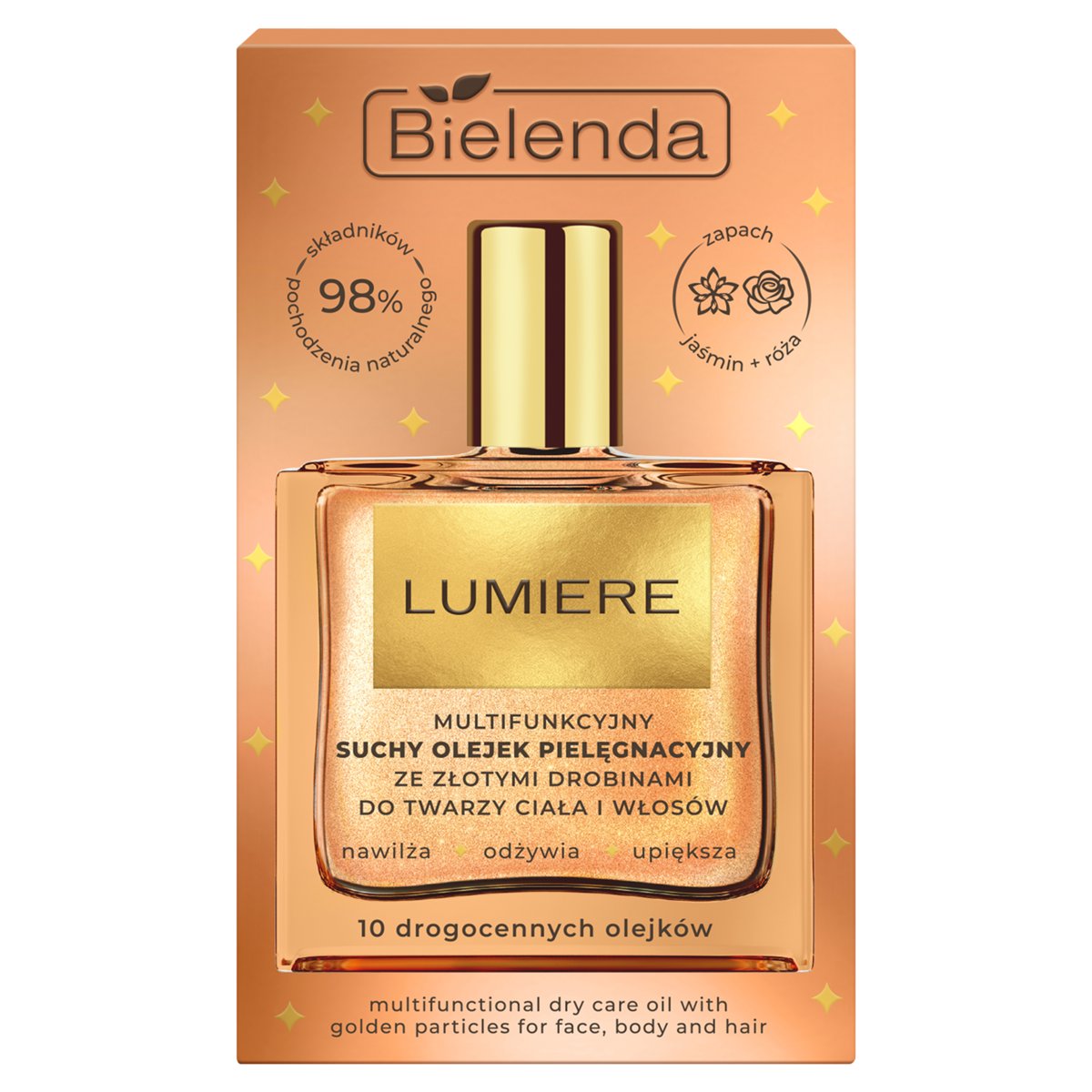 Multifunkcyjny suchy olejek Lumiere to luksusowa formuła, która dba o skórę twarzy i ciała oraz włosy, dostarczając im intensywnego nawilżenia, odżywienia i blasku. Dzięki starannie dobranym naturalnym olejkom, szybko się wchłania, nie pozostawiając tłustej warstwy, jednocześnie chroniąc przed utratą wilgoci i wzmacniając barierę ochronną skóry. Doskonale nadaje się do codziennego stosowania, niezależnie od typu skóry i włosów, nadając im jedwabistą miękkość oraz zdrowy wygląd.