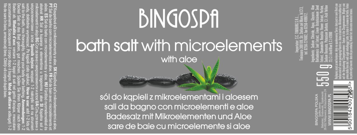 | Nazwa: | BINGOSPA, Niepieniąca Sól do kąpieli z mikroelementami i aloesem, 550g |