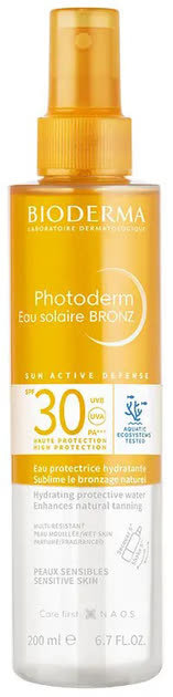 Bioderma Photoderm Eau Solaire Bronz SPF 30 to innowacyjna, dwufazowa woda ochronna, która zapewnia wysoką ochronę przeciwsłoneczną oraz wspomaga naturalne opalanie skóry. Dzięki lekkiej, nietłustej formule, produkt doskonale nadaje się do stosowania na twarz, ciało i włosy, zapewniając komfort i świeżość podczas ekspozycji na słońce.
