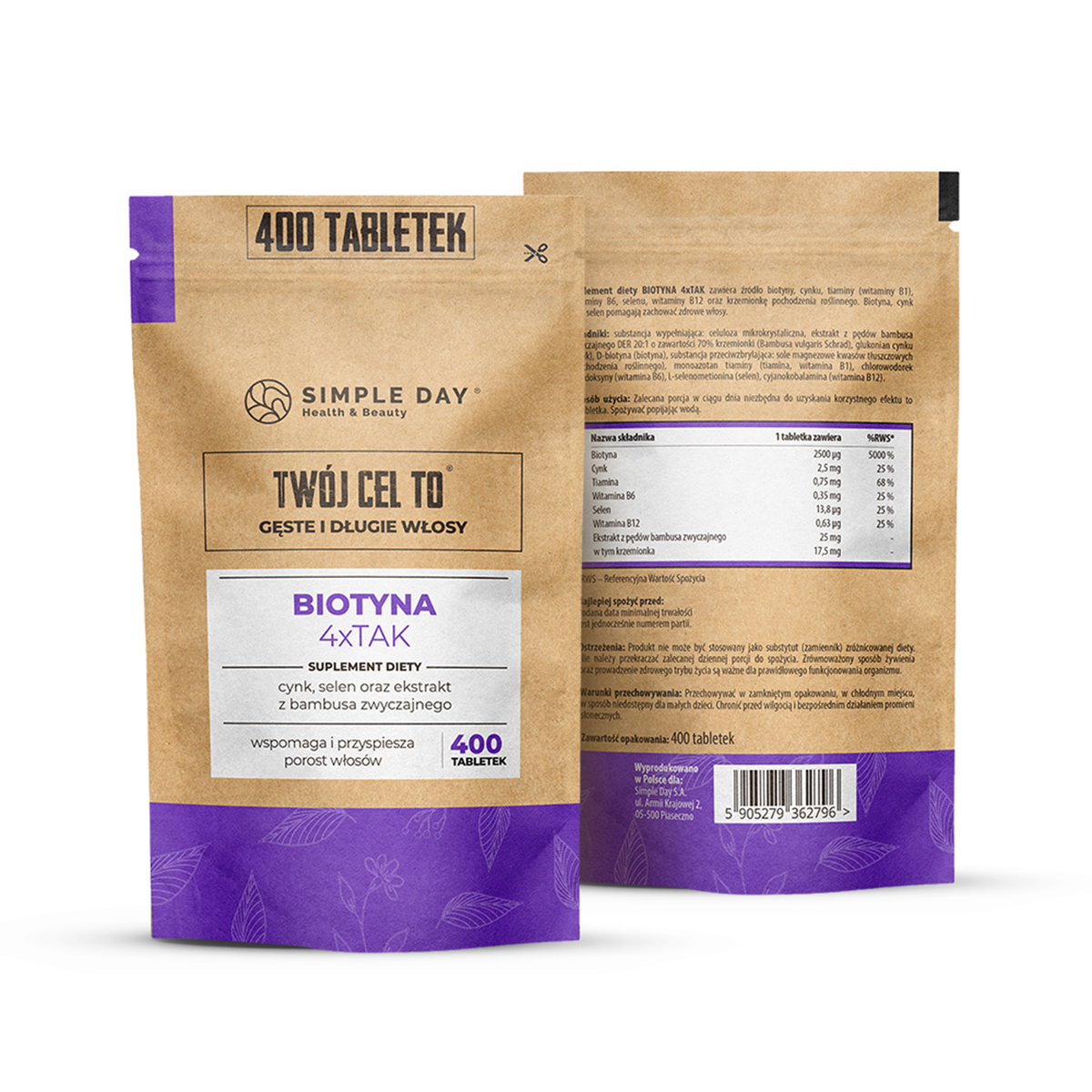 Biotyna 4x TAK to dawka 2,5 mg biotyny w jednej tabletce. Zawiera 400 tabletek w 1 opakowaniu.