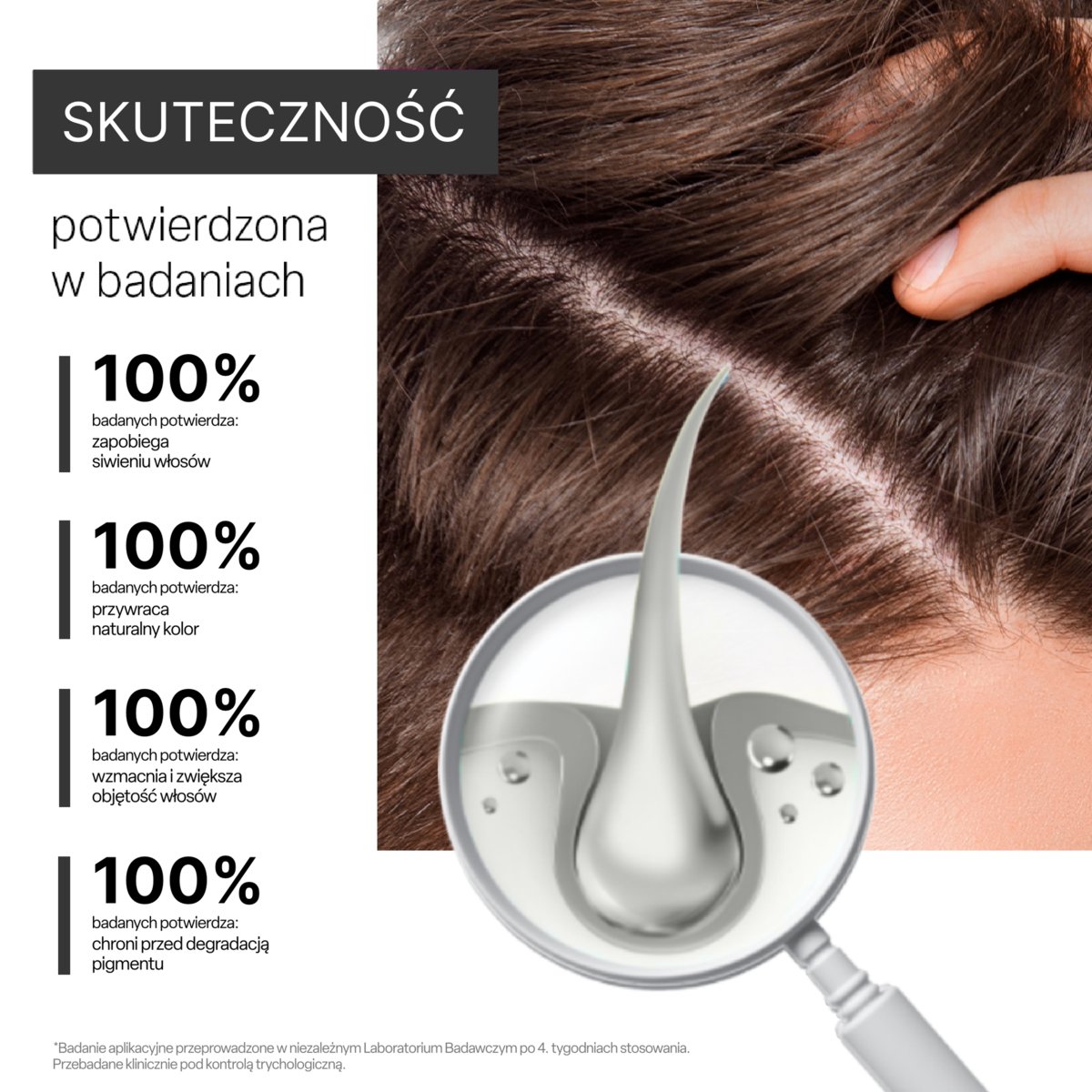 Specjalistyczna kuracja repigmentująca do włosów siwiejących zawiera składniki o wielokierunkowym, udowodnionym działaniu. 1,3% Color Reno-Protect CPLX pobudza produkcję melaniny, która odpowiada za pigmentację, a także chroni przed rozkładem pigmentów już występujących w strukturze włosa. 3% ekstrakt z henny przywraca naturalny kolor włosów, wzmacnia je i pogrubia, zwiększając objętość i gęstość. Kojący probiotyk oraz 1% D-pantenol długotrwale łagodzą i regenerują wrażliwą skórę głowy, a także pozytywnie wpływają na odnowę mieszków włosowych. Kuracja naturalnie tonuje włosy oraz chroni pigment przed degradacją spowodowaną czynnikami zewnętrznymi, a także wzmacnia i zapobiega siwieniu już na poziomie cebulek. Innowacyjna, lekka i nietłusta formuła nie obciąża oraz nie powoduje szybszego przetłuszczania się włosów.