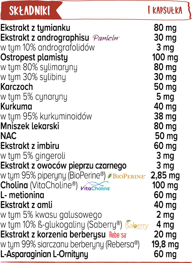 Składniki w jednej porcji (w jednej kapsułce): Ekstrakt z nasion ostropestu plamistego* standaryzowany na 80% sylimaryny oraz 30% sylibiny [DER 45:1], cholina* (VitaCholine®), ekstrakt z ziela tymianku pospolitego [DER 20:1], ekstrakt z korzenia mniszka lekarskiego [DER 20:1], ekstrakt z kłącza imbiru lekarskiego standaryzowany na 5% gingeroli [DER 30:1], L- metionina, L-asparaginian L-ornityny, ekstrakt z ziela karczocha zwyczajnego** standaryzowany na 5% cynaryny [DER 30:1], N-acetylo-L-cysteina (NAC), ekstrakt z kłącza kurkumy** standaryzowany na 95% kurkuminoidów [DER 45:1], ekstrakt z owoców amli standaryzowany na kwas galusowy 5% oraz 10% ß-glukogaliny (Saberry®) [DER 60:1], ekstrakt z liści andrographisu standaryzowany na 10% andrografolidów [DER 30:1] (Panicin™), ekstrakt z korzenia berberysu standaryzowany na 97% chlorowodorku berberyny [DER 60:1], ekstrakt z owoców pieprzu czarnego standaryzowany na 95% piperyny (BioPerine®), otoczka kapsułki: hydroksypropylometyloceluloza.