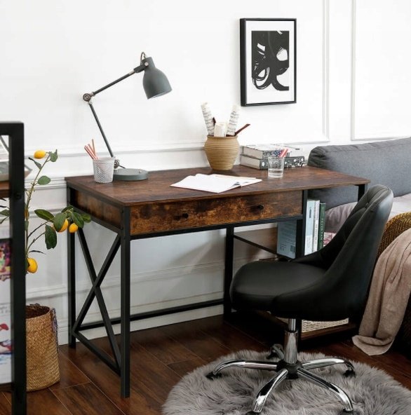 To biurko mówi! To biurko mówi, że inwestujesz w siebie, że to co robisz, robisz na serio! Mebel z lekko błyszczącą powierzchnią. Czarna żelazna rama i rustykalne elementy w fakturze drewna na górze nadają mu dodatkowego uroku w stylu vintage. Konstrukcja wzmocniona kratownicami. Biurko sprzedawane z półkami po prawej stronie, jednak można zmontować po drobnych korektach także na lewą stronę.