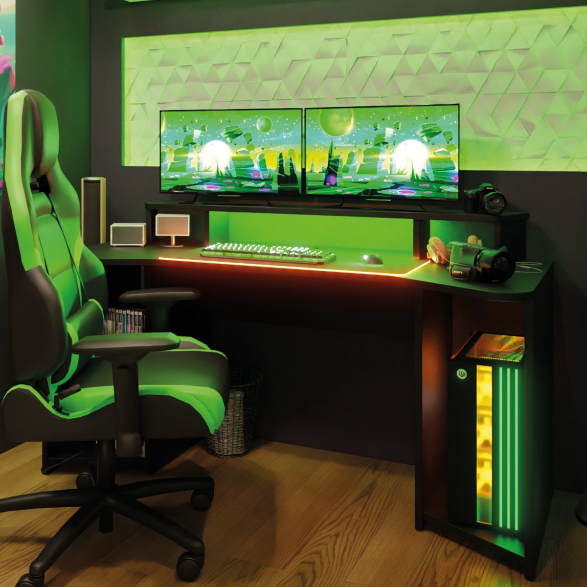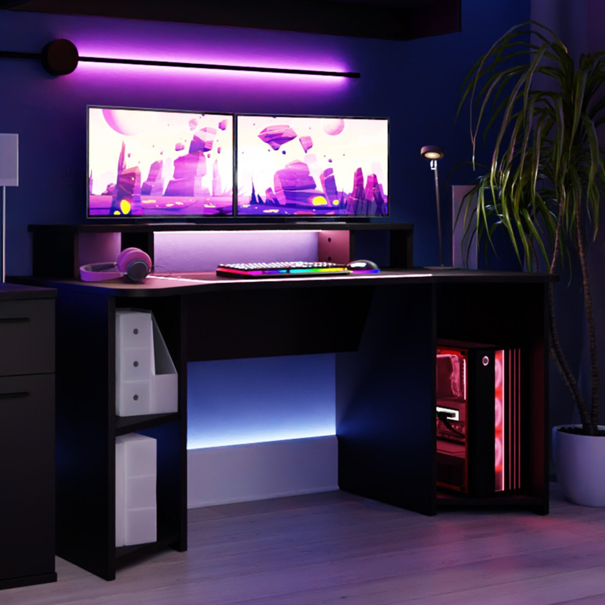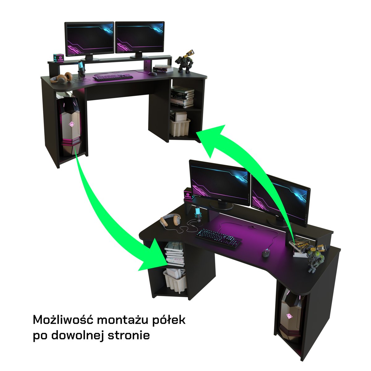 Biurko gamingowe SUPERNOVA221 LED - czarne Biurko z wielobarwnym oświetleniem LED i półkami. Blat o szerokości 160 cm dostarczy Ci dużą przestrzeń roboczą oraz miejsce na peryferia. Półki pomieszczą ...