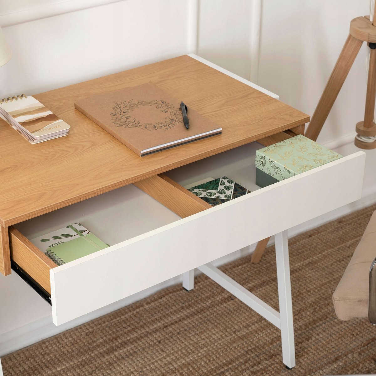 Biurko posiada szeroką szufladę podzieloną na dwa segmenty. Uporządkujesz w nich różne akcesoria biurowe i nie tylko, które zawsze chcesz mieć pod ręką.