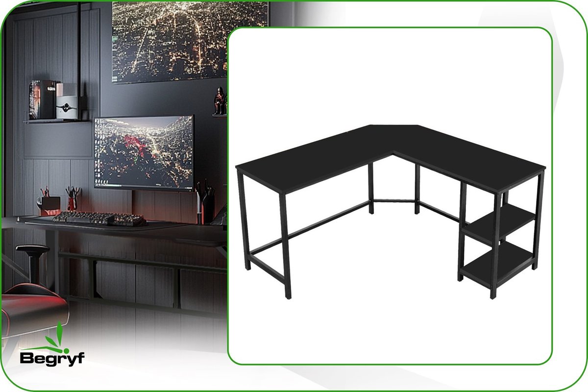 Biurko narożne duże z półkami czarne 138x138x75 VB8BK Begryf Bardzo solidny produkt – sprawdź! Eleganckie i funkcjonalne biurko z dwoma wbudowanymi półkami. Bardzo duży blat. Do wykorzystania w ...