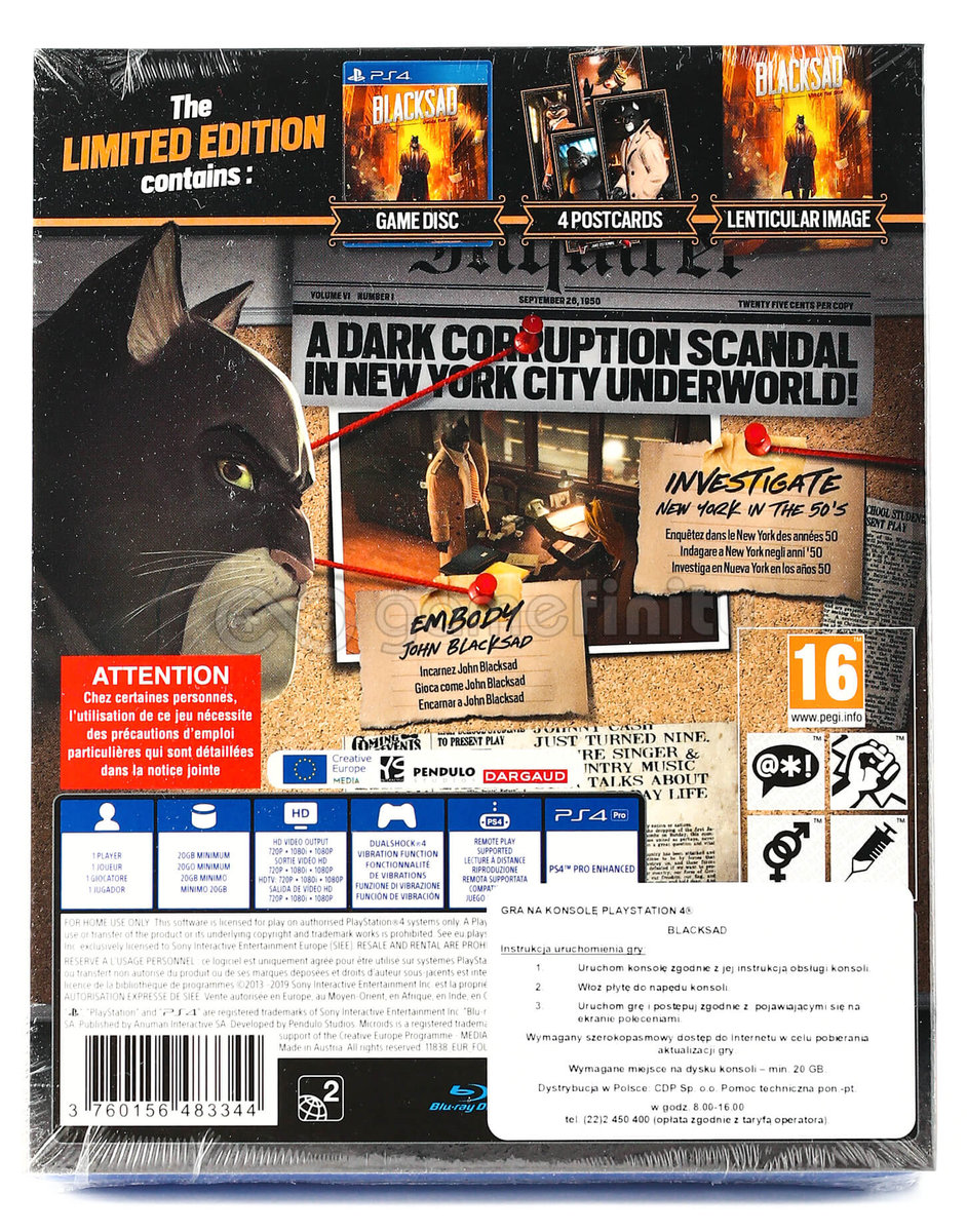 - Zupełnie nowa, integralna część historii o detektywie BLACKSADZIE osadzona w unikatowym świecie komiksu, który został idealnie odtworzony z myślą o graczach.