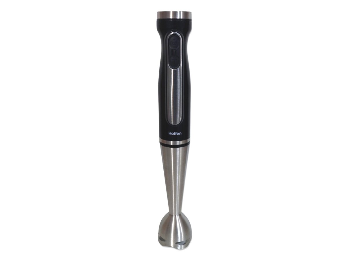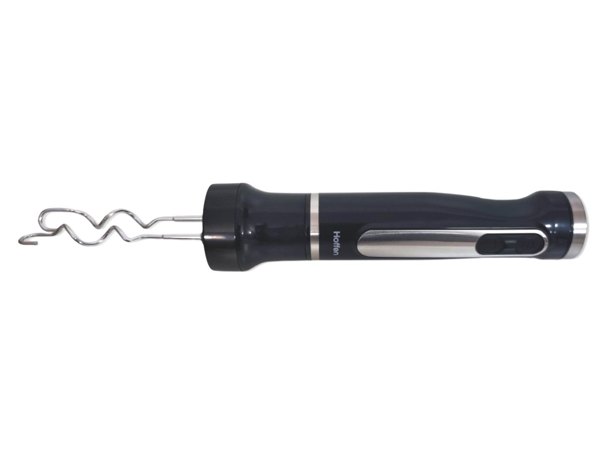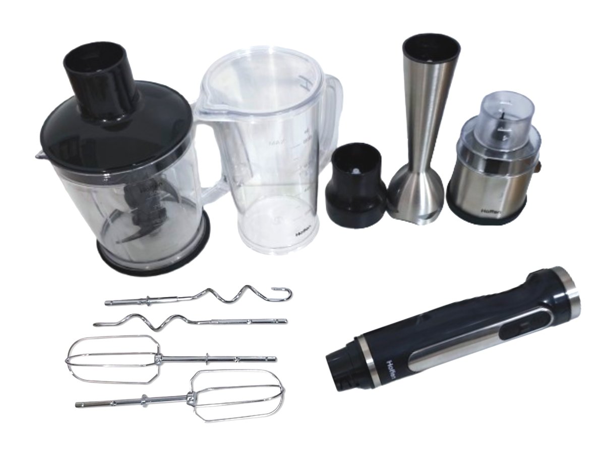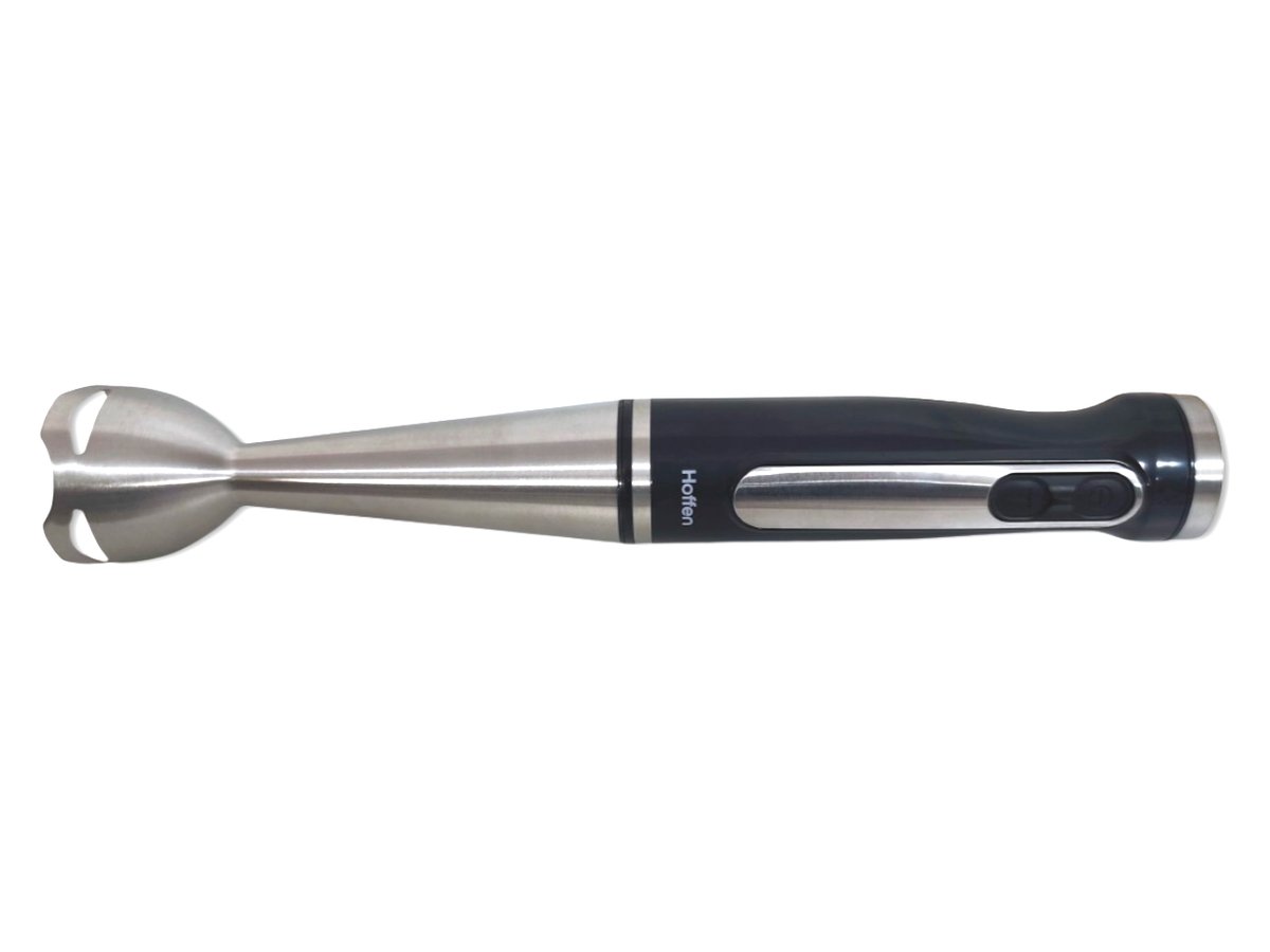 Blender ręczny 4w1 marki Hoffen o mocy 1200W. Blender wyposażony jest noże tnące wykonane z wysokiej jakości stali nierdzewnej, które świetnie radzą sobie z rozdrabnianiem składników na mniejsze kawałki. Blender posiada wyprofilowany uchwyt w taki sposób aby idealnie pasował do każdej dłoni i gwarantował bezpieczeństwo podczas użytkowania urządzenia. Blender posiada pokrętło do regulacji obrotów, przycisk uruchamiający urządzenie oraz przycisk uruchamiający funkcję Turbo. W skład zestawu wchodzą akcesoria umożliwiające: miksowanie, wyrabianie ciasta, rozdrabnianie, blendowanie i mielenie kawy. Maksymalny czas ciągłej pracy urządzenia to 30s lub 60s przy mieleniu kawy, po tym czasie urządzenie musi się schłodzić (przynajmniej 1min). Nasadka rozdrabniająca może być wykorzystywana do przygotowania dipów, sosów, zup, majonezu i potraw dla dzieci. Podczas pracy z Miinimalakserem 0,9L blender może rozdrabniać takie produkty jak mięsa, sery, cebula, zioła, czosnek, orzechy włoskie, migdały, śliwki itp. Nie należy siekać twardych produktów takich jak gałka muszkatołowa, ziarna kawy czy zbóż. Zestaw zawiera także pojemnik z tworzywa sztucznego o pojemności 0,8l z pokrywą.