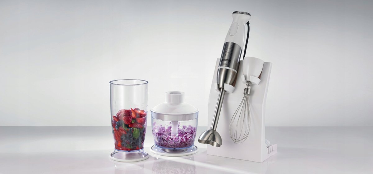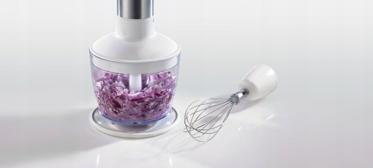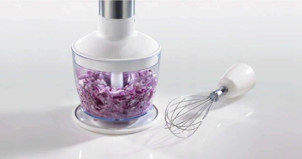 W zestawie pojemnik z miarką 0.5 l, rozdrabniacz, stojak oraz trzepaczka.