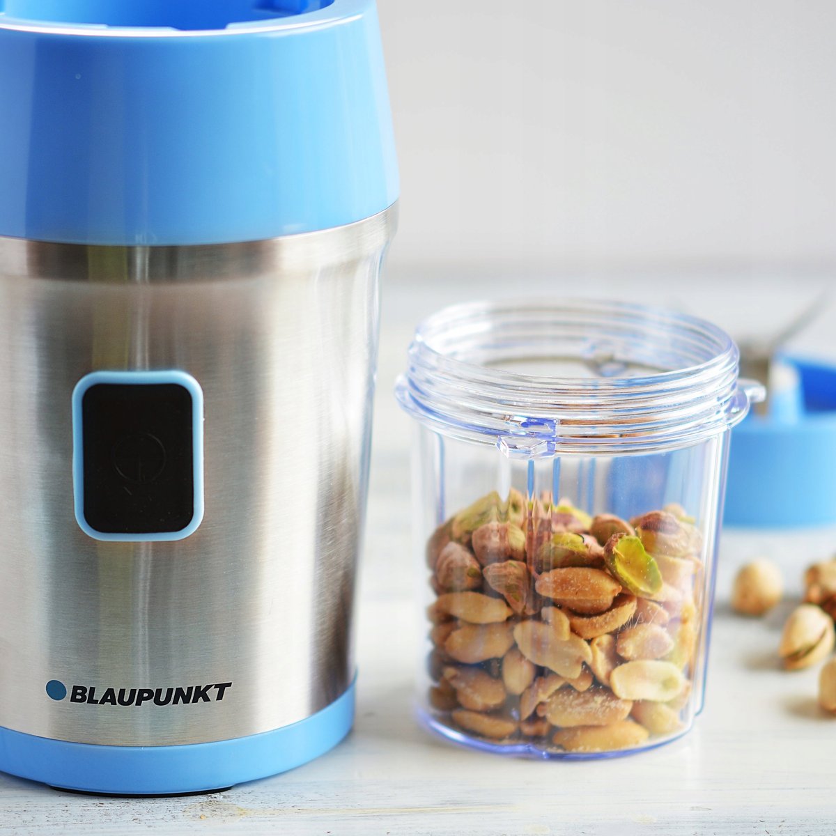 Blender personalny TBP601BL 220-240V~50/60Hz,700W; Aktywny tryb życia, zdrowe odżywianie oraz zbilansowana dieta to priorytety coraz większej liczby osób. Cenimy sobie świeże produkty, staramy się eliminować z diety tłuszcz, a w naszym planie dnia zawsze znajdzie się czas na aktywność fizyczną. Blender personalny marki Blaupunkt to wyjątkowe rozwiązanie dla entuzjastów zdrowego odżywiania, a także dla wszystkich żyjących w pośpiechu. Z modelem TBP601BL swój ulubiony i zarazem pożywny koktajl można zabrać wszędzie do pracy, do szkoły, na spacer do parku lub na poranny jogging. WYGODA UŻYTKOWANIA; W zestawie znajdują się dwa szczelne, trytanowe kubki o pojemności 0,4l i 0,57l, w których produkty są rozdrabniane, a dzięki dołączonym pokrywkom mogą służyć za pojemniki, w których mamy możliwość zabrania swojego ulubionego soku lub koktajlu np. na trening. Wystarczy wrzucić pokrojone warzywa lub owoce do kubka, nacisnąć łatwo dostępny przycisk włącznika i już po chwili cieszyć się pożywną przekąską. Wygodna zakrętka na kubek z zatykanym dzióbkiem do picia, tworząca funkcję bidonu, dopełnia komfortu użytkowania. Specjalnie zaprojektowane ostrza z czteroma nożami oraz moc 700 W zapewniają największą wydajność rozdrabniania oraz zadbają o to, aby nasz koktajl miał perfekcyjną konsystencję. UNIWERSALNY DESIGN; Stylowa, przeźroczysta obudowa ożywiona niebieskimi akcentami będzie doskonałym uzupełnieniem każdej kuchni, a niewielkie rozmiary TBP601BL sprawią, że urządzenie to będzie dobrym rozwiązaniem nawet w małych pomieszczeniach. Prosta konstrukcja oraz wyjmowane ostrza ułatwiają czyszczenie i konserwację urządzenia. Wszystkie elementy blendera pozbawione są szkodliwego bisfenolu A, dzięki czemu użytkownik ma pewność, że przygotowywane soki będą zawsze świeże, zdrowe i pożywne. DODATKOWA FUNKCJONALNOŚĆ; W zestawie znajduje się także młynek do kawy, w którym poza zmieleniem kawy ziarnistej na aromatyczną mieloną, można zrobić smaczne, zdrowe i uwielbiane przez wiele osób, masło orzechowe. W dołączonym do zestawu rozdrabniaczu z 1,2l misą z podwójnym rzędami ostrzy, możemy pokroić znaczną ilość składników i w wygodny sposób przygotować zdrową sałatkę czy uwielbiany przez wiele osób tatar.