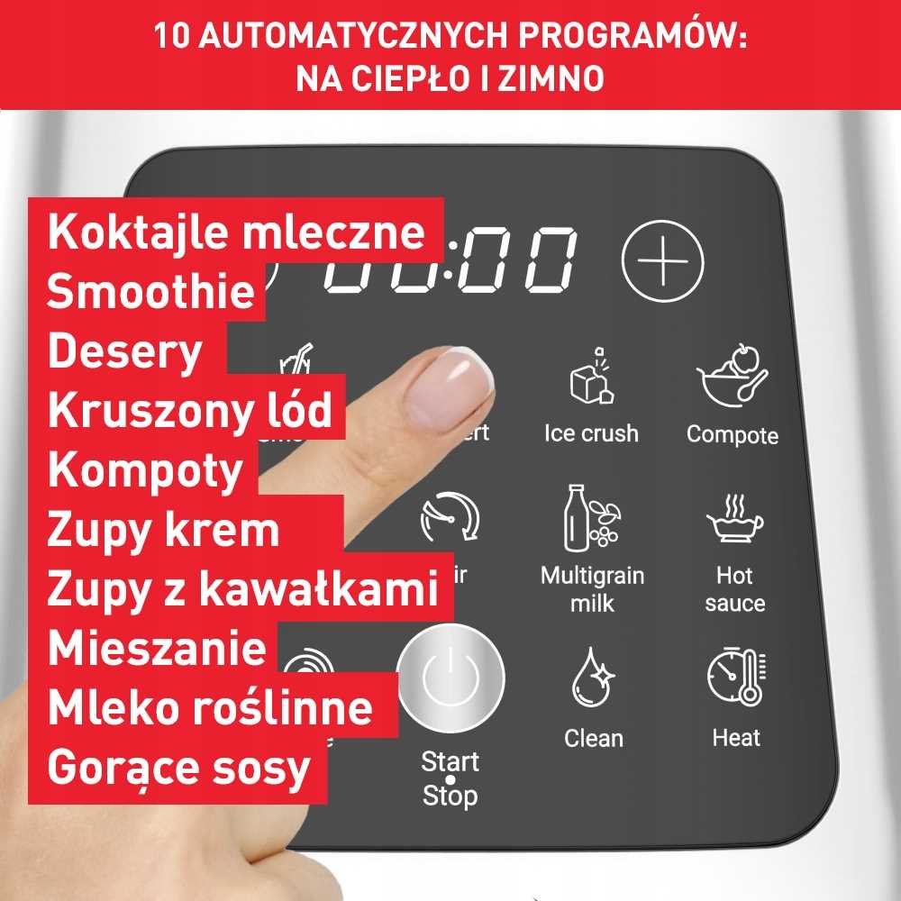 Ciesz się szeroką gamą potraw, dzięki 4 programom do blendowania na zimno (smoothie, mleczne szejki, desery, kruszony lód) oraz 6 programom do blendowania na gorąco (kompoty, zupy-kremy, zupy z kawałkami, mieszanie, mleko roślinne, gorące sosy).