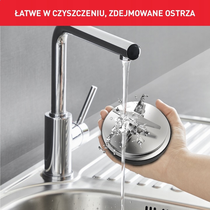 Zdejmowalne ostrza i funkcja dokładnego czyszczenia Dbanie o czystość urządzenia ułatwiają zdejmowalne noże i funkcja dokładnego czyszczenia, która zabija 99,99% bakterii* bez potrzeby używania płynu do mycia naczyń. *Badanie wykonane przez niezależne laboratorium