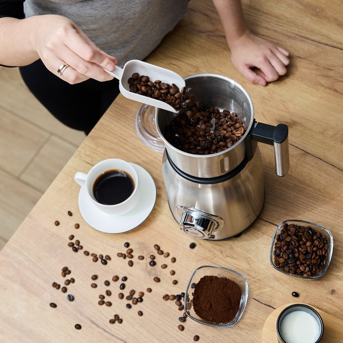 4. Możliwość mycia w zmywarce - wygodnie umyj w zmywarce elementy takie jak: wyjmowana miarka, pokrywa kielicha, uszczelka pokrywy kielicha, kielich, pokrywka młynka, uszczelka pokrywki młynka, pokrywki kubków, kubki podróżne