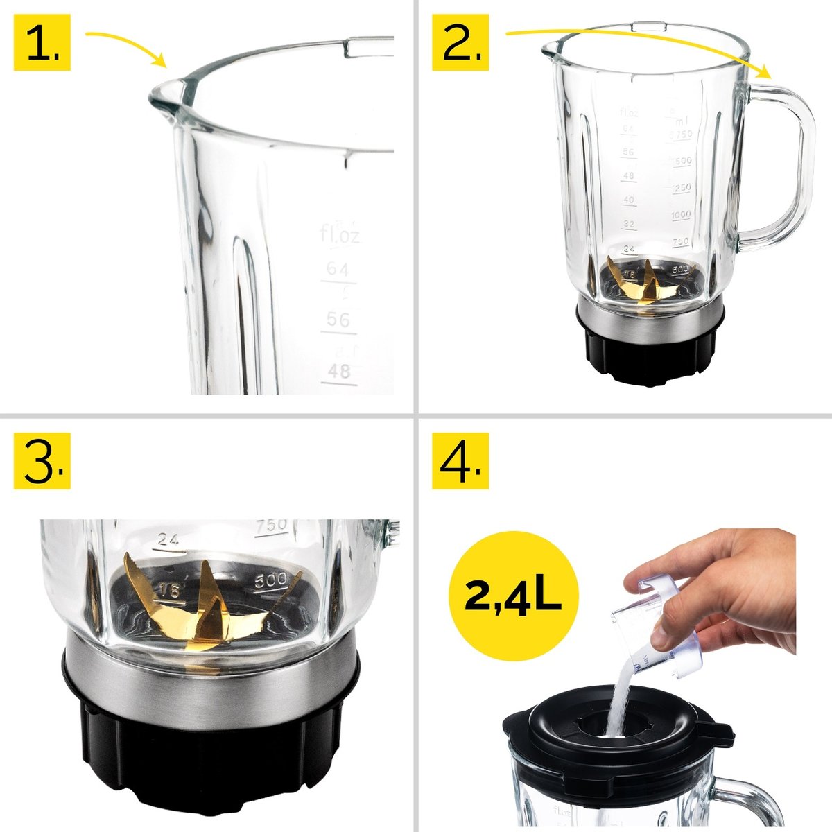 ▶ 2,4 L - duża pojemność maksymalna - to prawie 2 litry pojemności roboczej, dzięki której przygotujesz za jednym razem smoothie nawet dla 8 osób w 225 ml szklankach