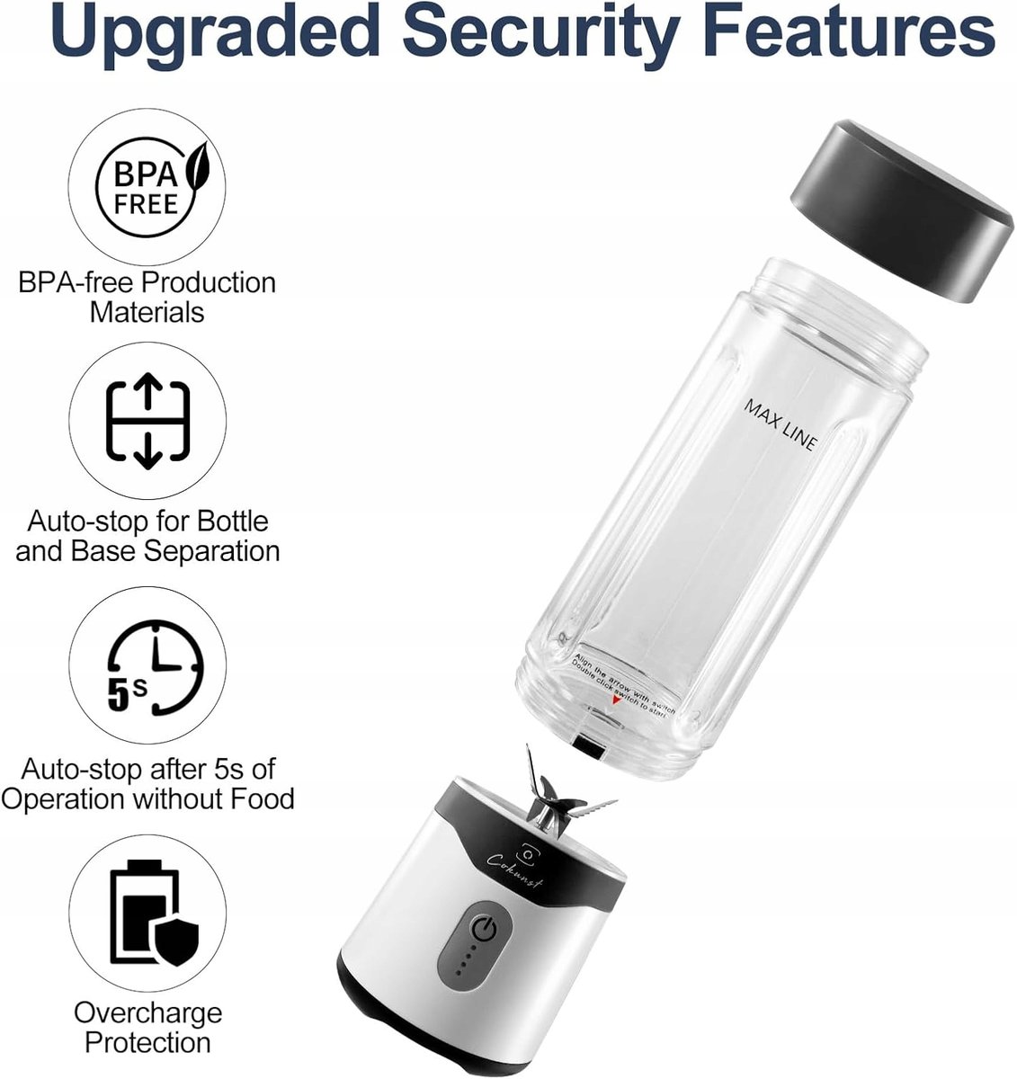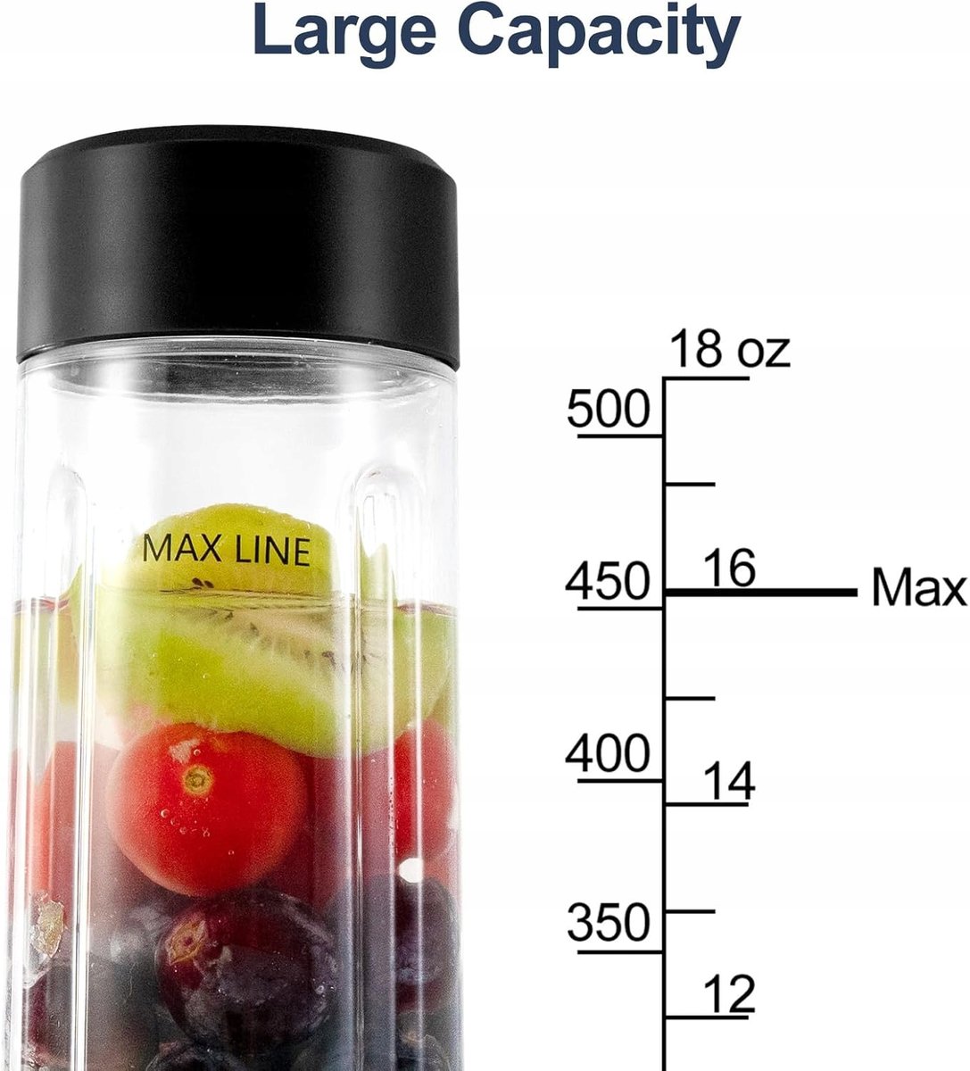 - Duża pojemność i łatwa obsługa. Przenośny blender przyjmuje butelkę o dużej pojemności 530 ml. Wystarczy włożyć składniki, wyrówj i dokręcić butelkę do mieszania i podstawę, kliknij dwukrotnie przycisk, aby uzyskać pyszny pój.